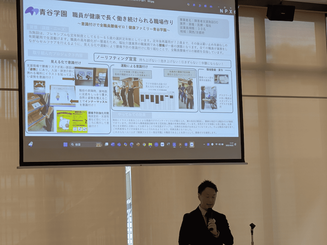 続いて、社会福祉法人青谷学園 理事・障害者支援施設青谷学園 施設長の小林さんから、同法人が取り組んだプロジェクト「職員が健康で長く働き続けられる職場作り〜意識付けで全職員腰痛ゼロ!健康ファミリー青谷学園〜」について説明がありました。