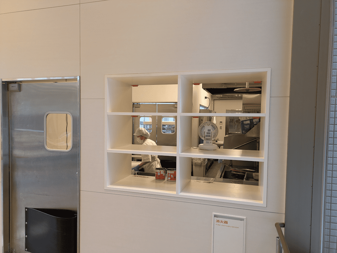 まず、事業所内見学で訪れたのは施設利用者に食事を提供するための調理場。調理員は衛生面への考慮から帽子・マスク・調理白衣を着用する必要があり、特に夏場は「食器洗浄機を使用する際に熱気がこもり、暑さが辛くなってきた」という意見を受け、サーキュレーターを導入。送風により空気を循環させることで熱気を逃して暑さがやわらげられるため、働きやすい環境改善に貢献しています。