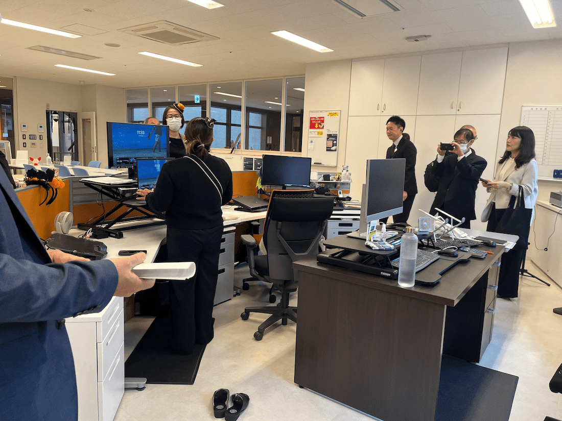 職業病である腰痛予防のため、職員には腰痛ベルトを貸与し、着用が義務化されていますが、デスクワークの多い職員も腰痛に悩むことが多いため、同じ姿勢による腰や背中への負担軽減を目的に、高さが調整できるスタンディングデスクを導入。