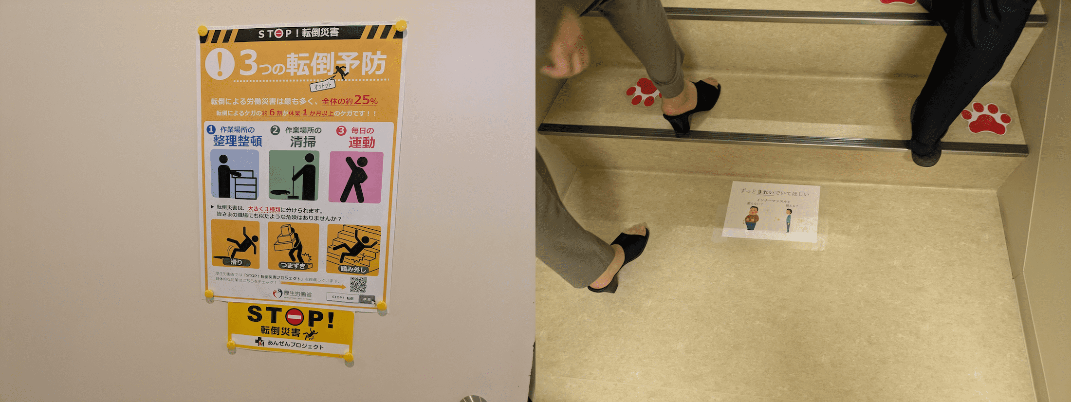また、階段利用時の転倒リスクを減らすため、階段へと続くドアに転倒予防ポスターを張って注意喚起しているほか、階段に肉球のイラストを貼ることで昇降時に足底をしっかり置く意識付けでインナーマッスルが鍛えられる工夫も。それにより腰の負担が軽減し、腰痛を発症する職員ゼロが継続できているのだとか。