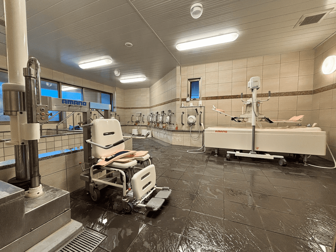施設利用者用の大浴場には、座ったまま浴槽へ移動して入浴できるリフトチェアや、寝ている姿勢のまま入浴可能なストレッチャータイプの特殊浴槽を導入。なお、特殊浴槽は今年度中に最新式のものへと更新する予定とか。これらの機器を用いることで、利用者の身体への負担を減らすだけではなく、職員が腰をかがめた無理な体勢で入浴介助をしないことで、腰痛対策や労務環境の改善に寄与しています。