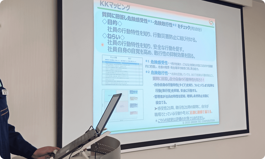 その後、株式会社グリーンテックの平野さんから同社の事業紹介、安全への取り組み、「安全人間育成活動」についての説明がありました。