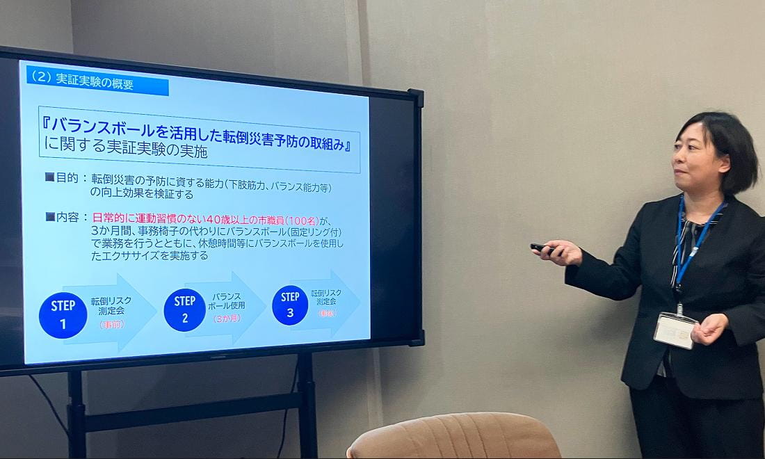 なお、福岡市では先に紹介した「転倒リスク測定会」に加え、バランスボールを使った新たなエクササイズプログラムの展開、各職場での安全パトロールや啓発活動など、転倒災害の防止に向けて、さまざまな取組を行っていることが紹介されました。