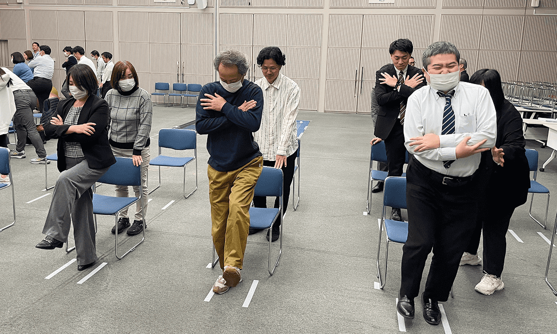 今回の「安全衛生見学会」では、取組の背景と実施内容の説明に加え、参加者たちが職員と共に「転倒リスク測定会」を体験しました。