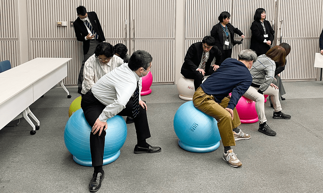 事前に、下肢筋力・バランス能力・敏捷性を測る3種目の測定会を開催。同時に、転倒予防の必要性やバランスボールの正しい乗り方、休憩時間にも行える簡単なエクササイズのレクチャーも行うことで、3ヶ月間にわたる実証実験へのモチベーションを上げる取り組みも行いました。なお、楽しみながらエクササイズを継続してもらうための工夫として、株式会社ルネサンスから提供されるバランスボールの色やサイズを対象となる市職員が選べるようにしたそうです。
